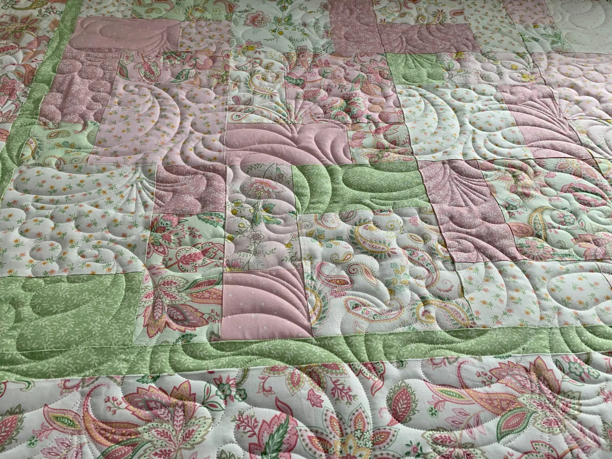 I have over 500 designs that I use for all over quilting. When you drop off your quilt, I will ask you if you have a sense of what type of design you are after (for example, feathers, circles, butterflies, masculine, etc). I am happy to show you a few ideas on my computer in my home office when you drop off your quilt(s), or I can send you a few ideas via text or email after I have had a chance to look at your quilt more closely. Some customers also let me choose the design completely. There is a gallery of pictures on this website (and I will add more gradually). Each picture includes the name of the quilting design. I have more designs available than what is reflected on my website.
